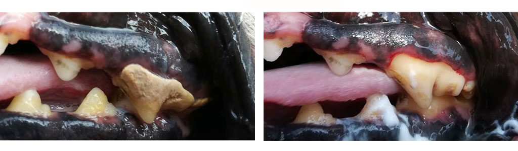 Der eingesetzte sanfte Ultraschall reinigt das Hundegebiss sehr schonend und greift die Zahnstruktur des Hundes nicht an.